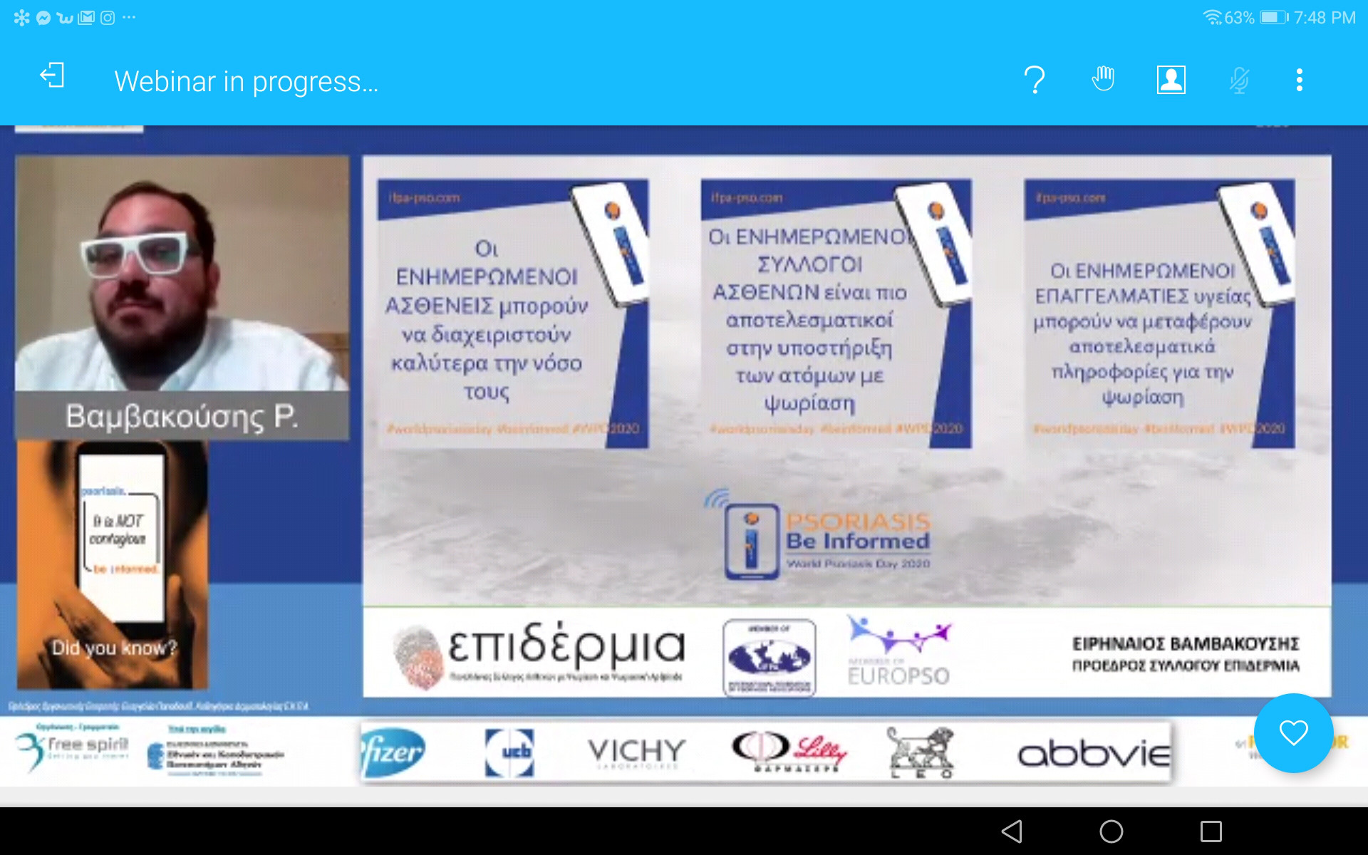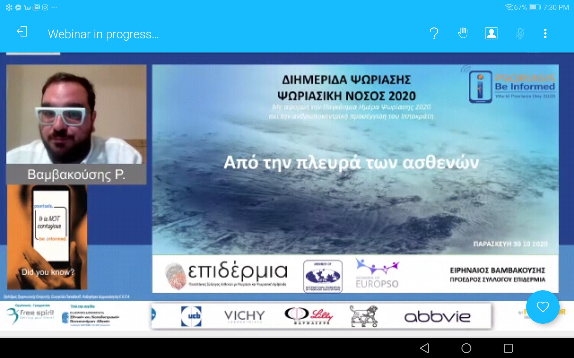 Ο Πρόεδρος του Επιδέρμια, Ρένος Βαμβακούσης, στην εισήγησή του αναφέρθηκε στο Μήνυμα της Παγκόσμιας Ημέρας Ψωρίασης 2020 που είναι «Ενημερώσου» και τόνισε ότι η έγκυρη ενημέρωση όλων των εμπλεκόμενων μερών (ασθενείς, κοινωνία, σύλλογοι ασθενών, επαγγελματίες υγείας, φορείς λήψης αποφάσεων) είναι ιδιαιτέρως σημαντική και άκρως απαραίτητη για μία ολοκληρωμένη προσέγγιση της ψωρίασης. Τέλος, αναφέρθηκε στην ψωρίαση από την πλευρά του ασθενή, εστιάζοντας στην αλληλεπίδραση του ασθενή με τους γιατρούς, το κράτος, την κοινωνία αλλά και με την ίδια την ψωριασική νόσο.